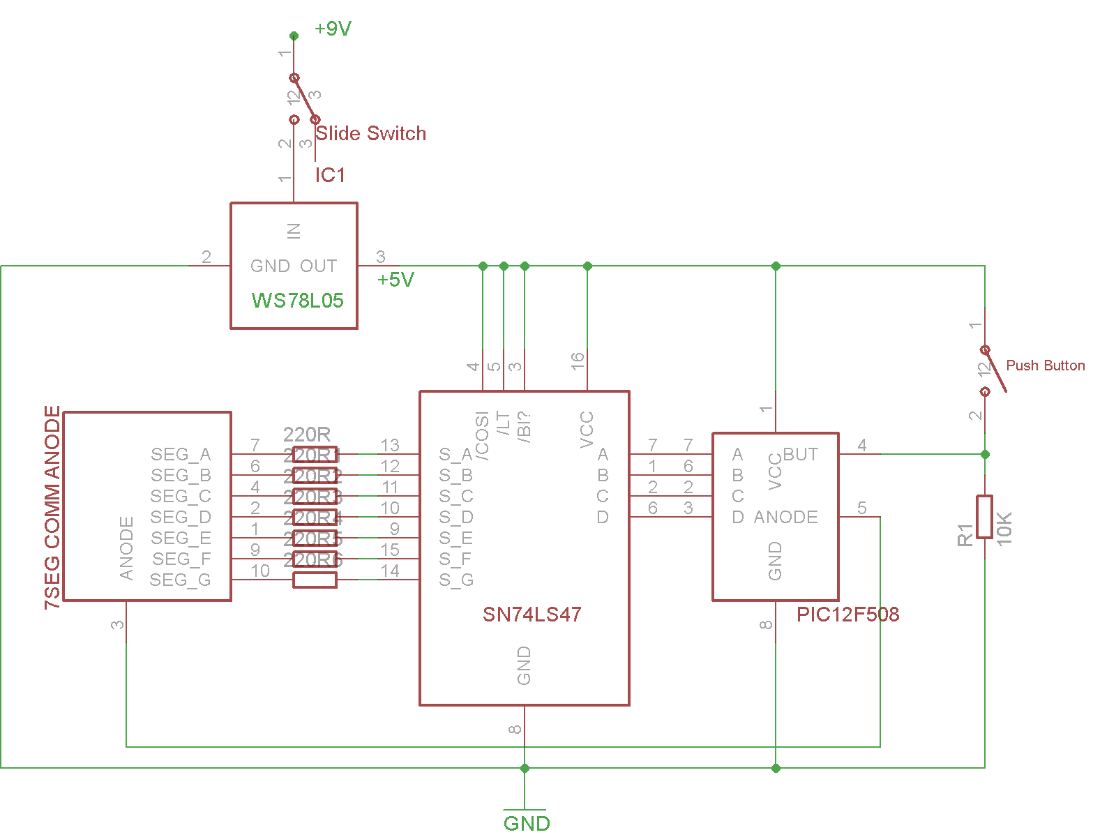 Náhodné hodnoty jsou "generovány" pomocí interního, neustále se inkrementujícího čítače TMR0. Další věc, asi je vidno na videu, že deska není napájena z 9V baterie — toto je druhá verze, kdy jsem zkusil zapojení zjednodušit tím, že jsem zkusil jet na 3.3V, tj. odstranil WS78L05 a napájím pouze z 3V CR2032 článku. V tom případě asi nejsou potřeba předřadné 220R rezistory. S 3.3V to funguje spolehlivě jen při plně nabitém článku, dle datasheetu SN74LS47 potřebuje 5V, což bude asi ten problém.